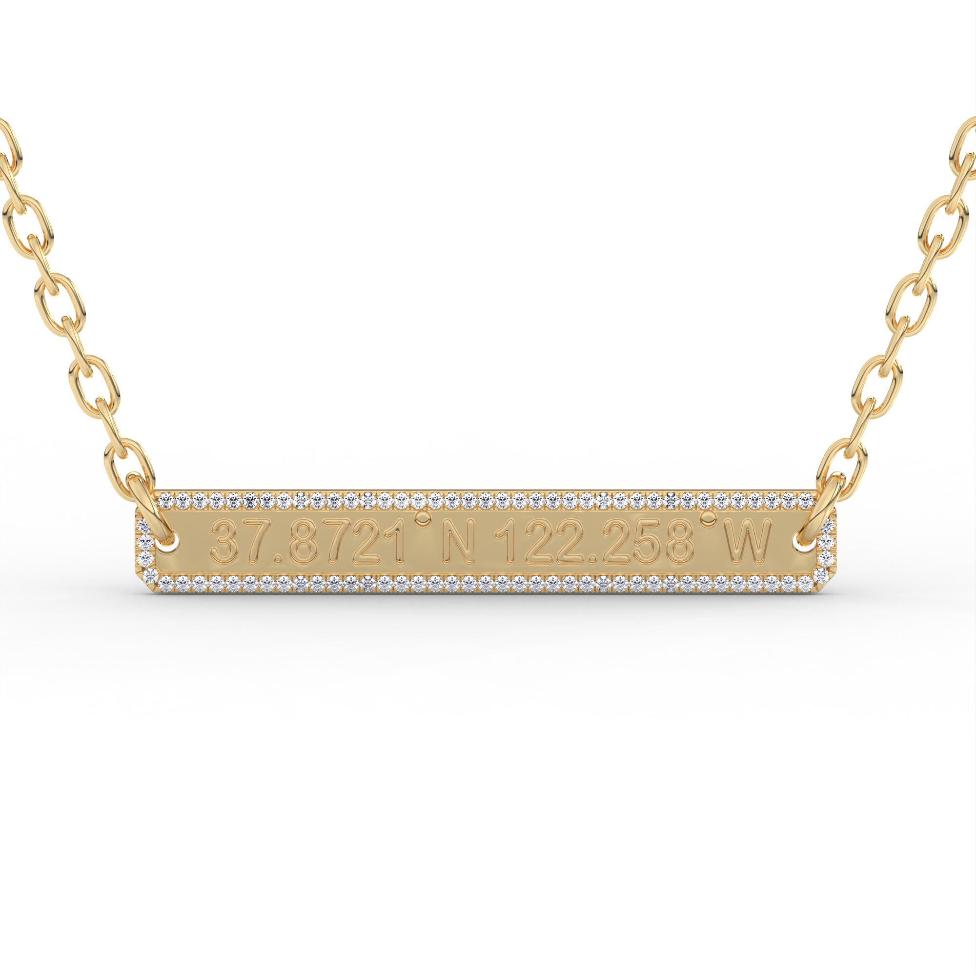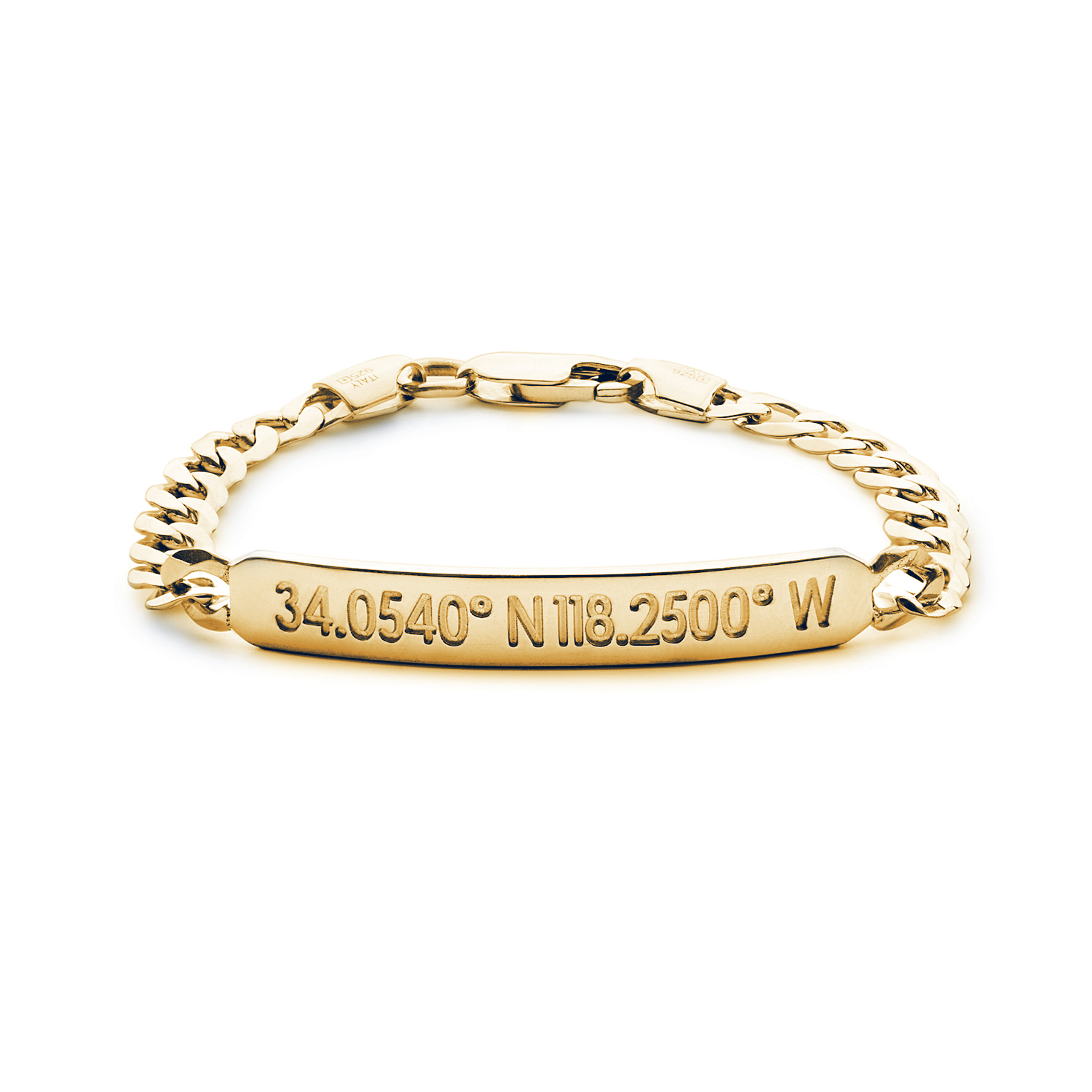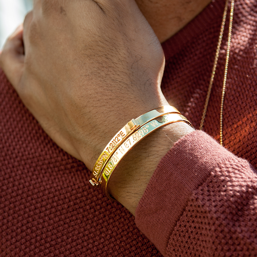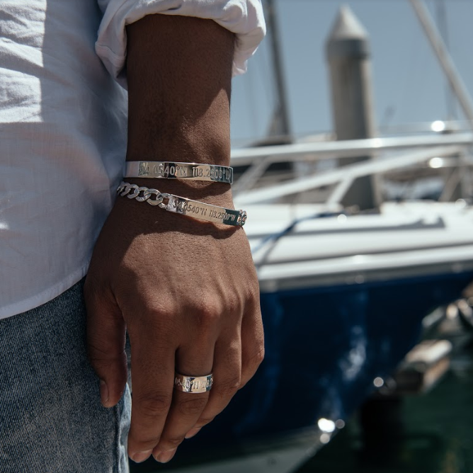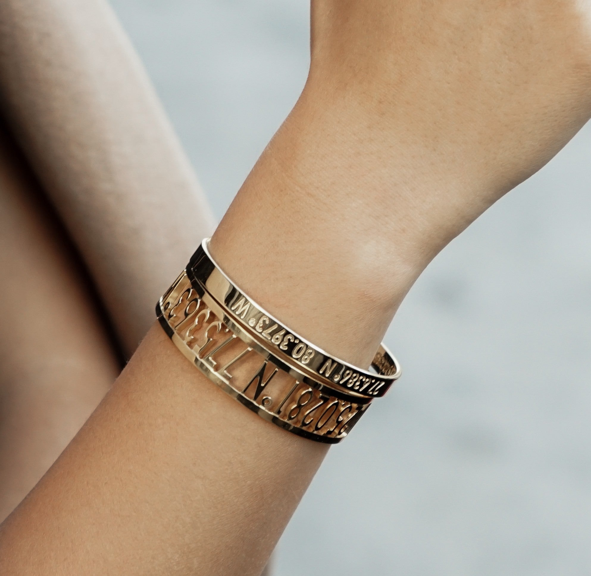 Customizable, personalized jewelry engraved with Earth’s longitude and latitude coordinates, marking the place where meaningful memory happened